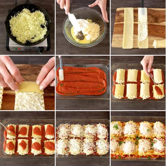 وزعي طبقة من البشاميل المحضر في صينية، يليه طبقة من اللازانيا المسلوقة، ثم طبقة أخرى من البشاميل، يليها طبقة الحشوة ووزعيها بالتساوي.
