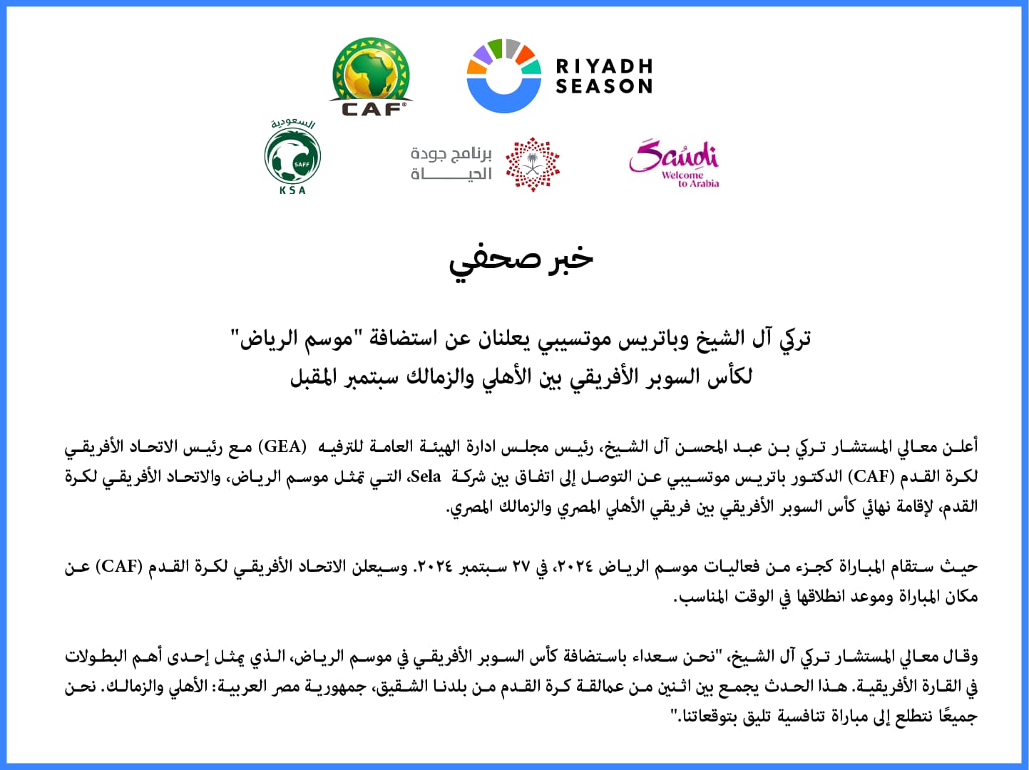 أعلن المستشار تركي أل الشيخ في بيان مشترك مع الإتحاد الإفريقي لكرة القدم، عن إستضافة العاصمة السعودية الرياض، لنهائي السوبر الإفريقي بين الزمالك والأهلي، برعاية موسم الرياض.