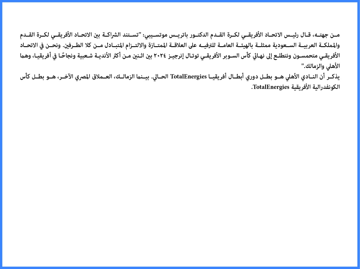 وأضاف بارتيس موتسيبي رئيس الإتحاد الإفريقي:" نحن سعداء بإستضافة المملكة العربية السعودية لكأس الوبر، ومتحمسون لمشاهدة مباراة تجمع بين إثنين من أهم الأندية والأكثر شعبية في إفريقيا، الأهلي والزمالك.
