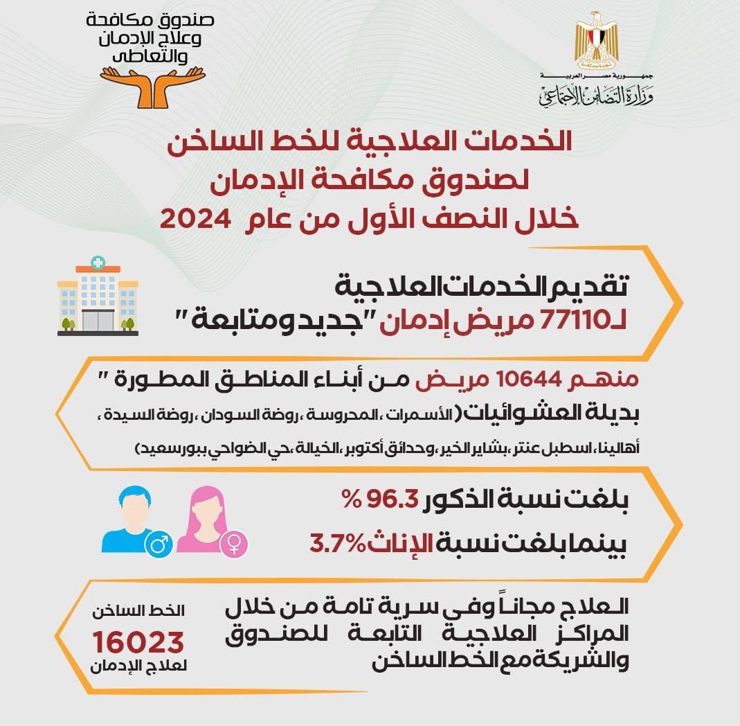 نشر صندوق مكافحة وعلاج الإدمان والتعاطى برئاسة الدكتورة مايا مرسى وزيرة التضامن الاجتماعي ورئيس مجلس إدارة الصندوق انفوجراف على الصفحة الرسمية للصندوق " الفيس بوك " عن الخدمات المقدمة من الخط الساخن لعلاج الإدمان "16023"، خلال النصف الأول من عام 2024 .
