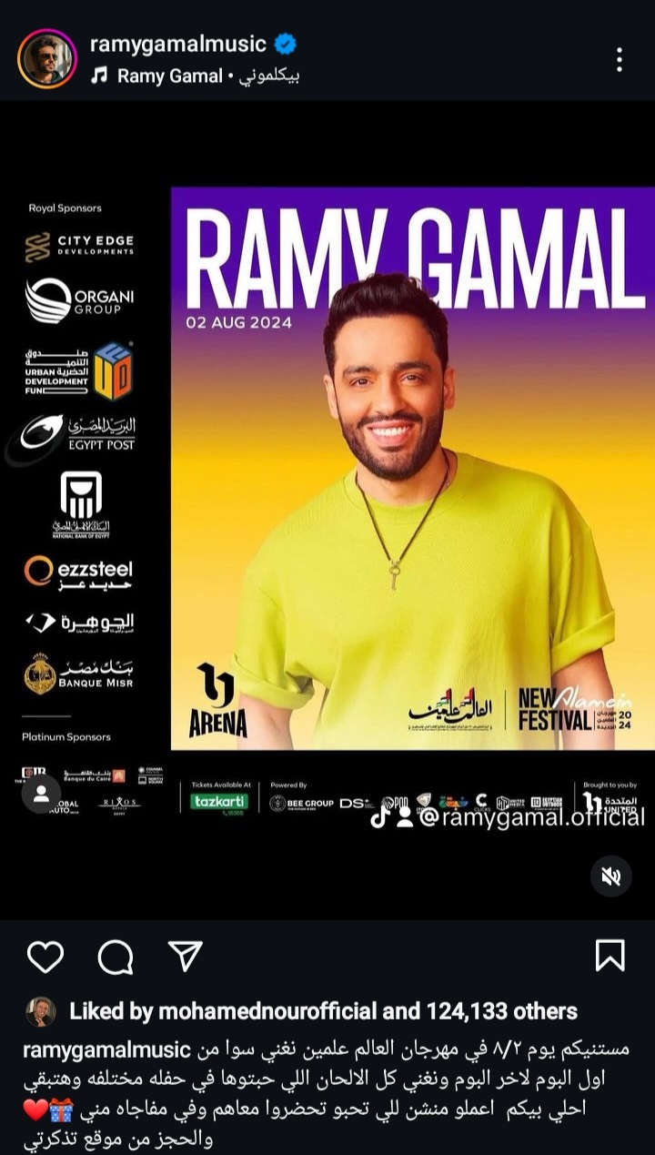 نشر النجم رامي جمال البوستر الدعائي لحفله في مهرجان العلمين عبر حسابه بموقع تبادل الفيديوهات والصور «إنستجرام» معلقآ " : «مستنيكم يوم 8-2 في مهرجان العالم علمين نغني سوا من أول البوم لآخر البوم، ونغني كل الألحان اللي حبتوها في حفلة مختلفة وهتبقى أحلى بيكم اعملوا منشن للي تحبو تحضروا معاهم، وفي مفاجأة مني، والحجز من موقع تذكرتي».