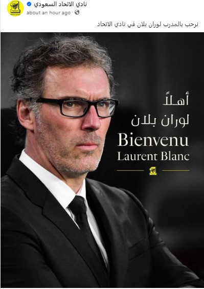 وقال اتحاد جدة السعودي عبر الصفحة الرسمية للنادي على فيسبوك:" نرحب بالمدرب الجديد لوران بلان في الاتحاد".