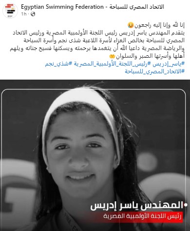 يتقدم المهندس ياسر إدريس رئيس اللجنة الأولمبية المصرية ورئيس الاتحاد المصري للسباحة بخالص العزاء لأسرة اللاعبة شذى نجم وأسرة السباحة والرياضة المصرية داعيا الله أن يتغمدها برحمته ويسكنها فسيح جناته ويلهم أهلها وأسرتها الصبر والسلوان».