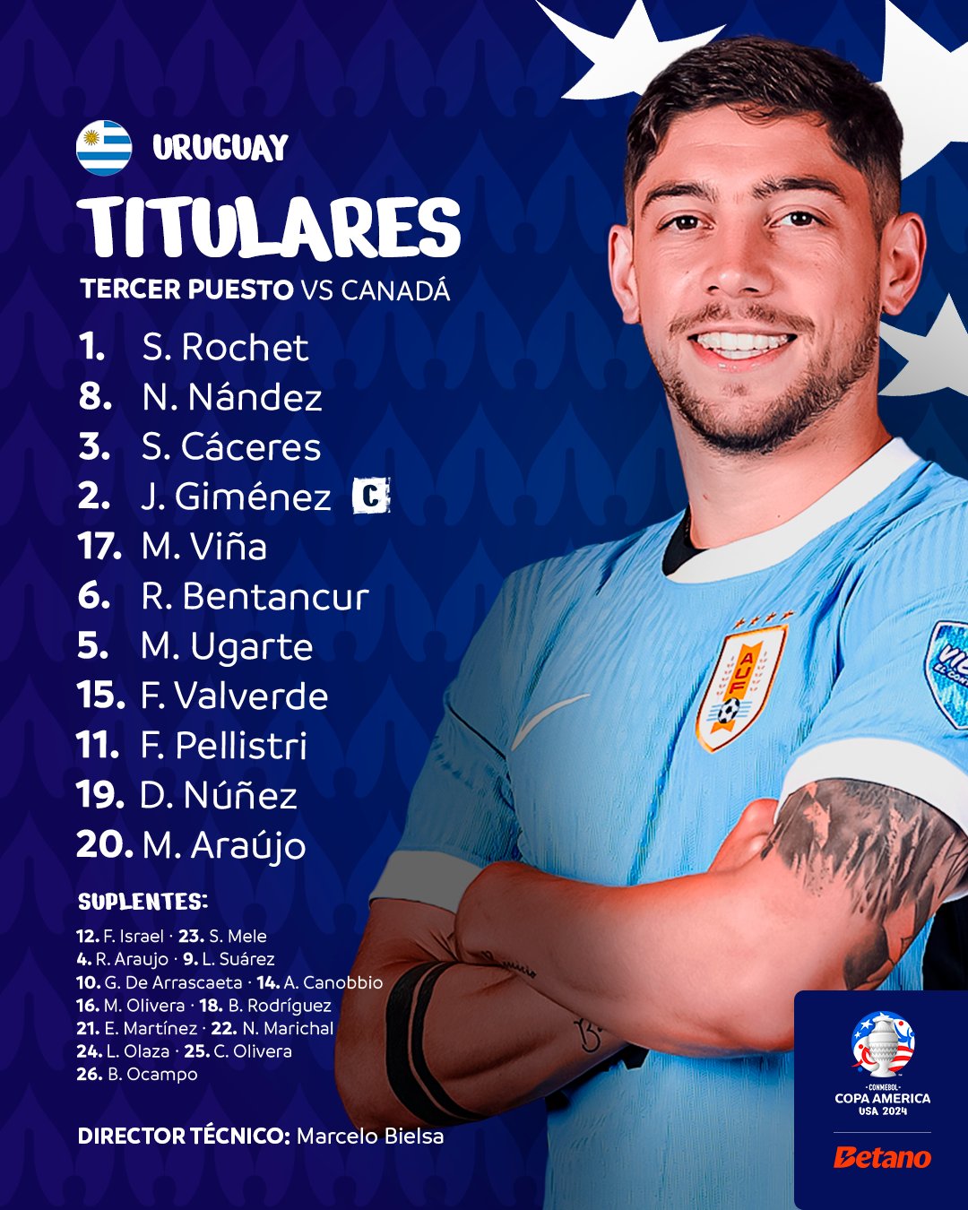 خط الوسط: فيديريكو فالفيردي، رودريجو بينتانكور، مانويل أوجارتي.