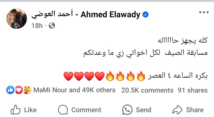 كشف الفنان أحمد العوضي، عن تفاصيل مسابقة جديدة: حيث وشارك عبر صفحته الرسمية " فيس بوك " بوست له وكتب " كله يجهز حاله ، مسابقة الصيف لكل إخواتي زي ما وعدتكم