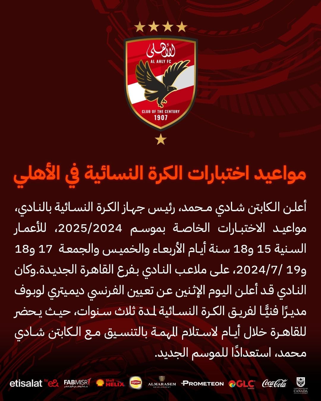 وقال الأهلي في بيانه: “أعلن الكابتن شادي محمد، رئيس جهاز الكرة النسائية بالنادي الأهلي ، مواعيد الاختبارات الخاصة بموسم 2024/2025، للأعمار السنية 15 و18 سنة أيام الأربعاء والخميس والجمعة 17 و18 و19 /7/2024، على ملاعب النادي بفرع القاهرة الجديدة.”