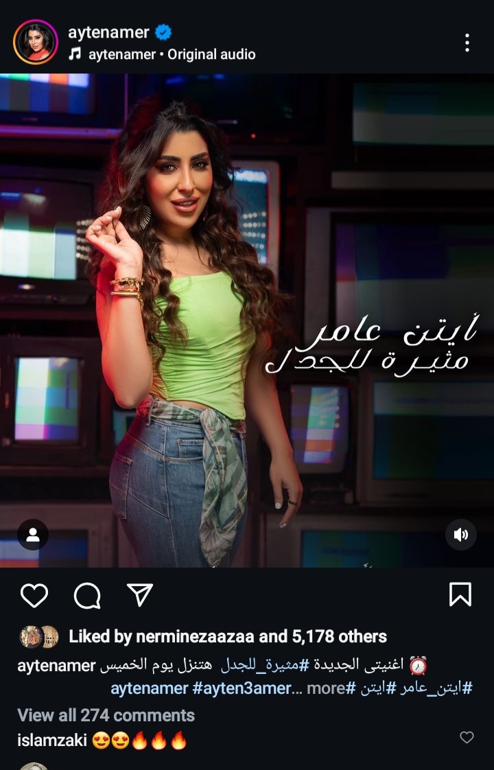 ونشرت آيتن خلال صفحتها البوستر الدعائي علي "إنستجرام"، وعلقت: "أغنيتى الجديدة "مثيرة للجدل"، هتنزل يوم الخميس".
