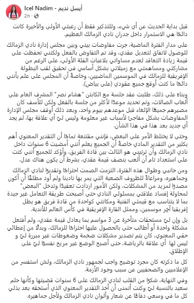 وقالت أيسل نديم في بيان رسمي لها على صفحتها الرسمية على موقع التواصل الإجتماعي فيسوك:" قبل بداية الحديث عن أي شيء، وللتذكير فقط أن رغبتي الأولى والأخيرة كانت دائمًا هي الاستمرار داخل جدران نادي الزمالك العظيم.
