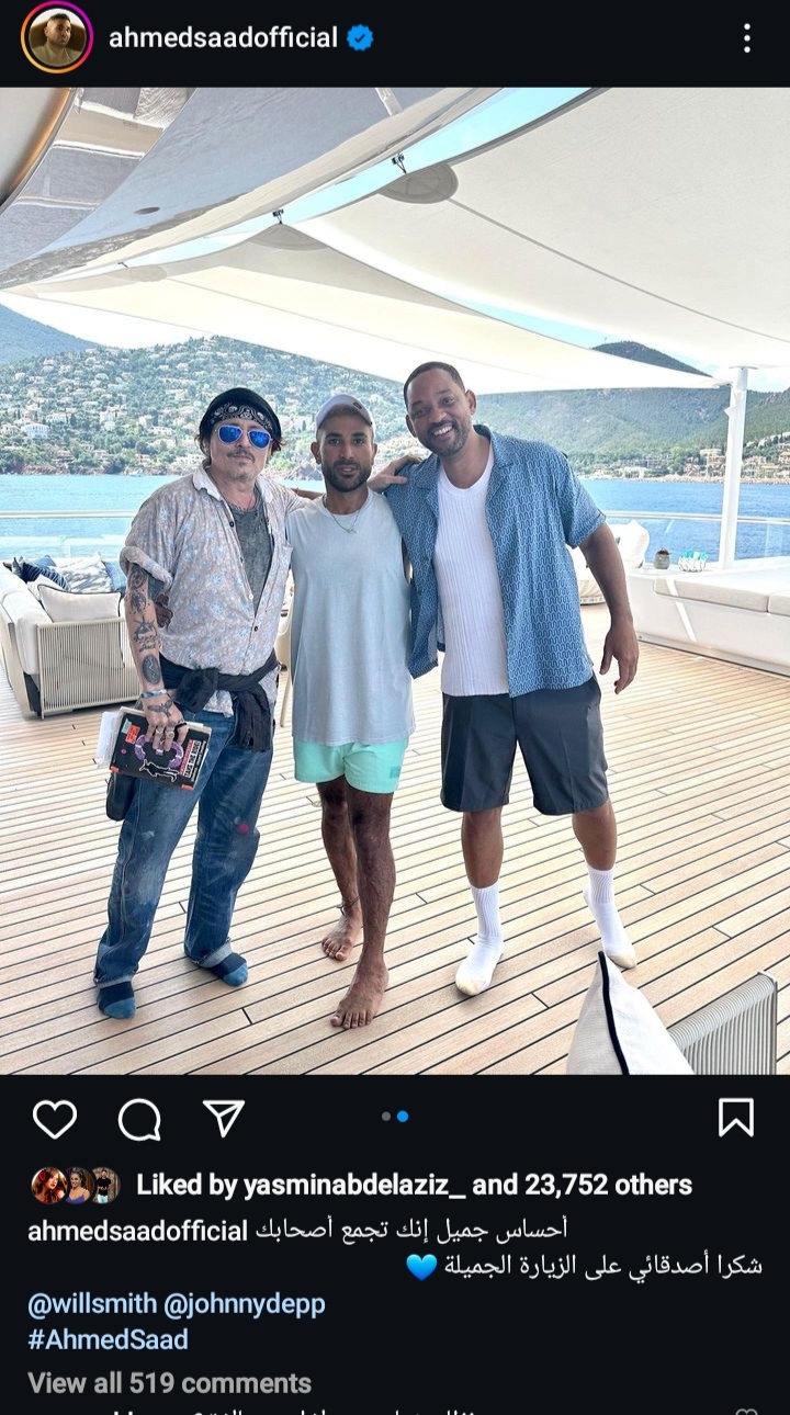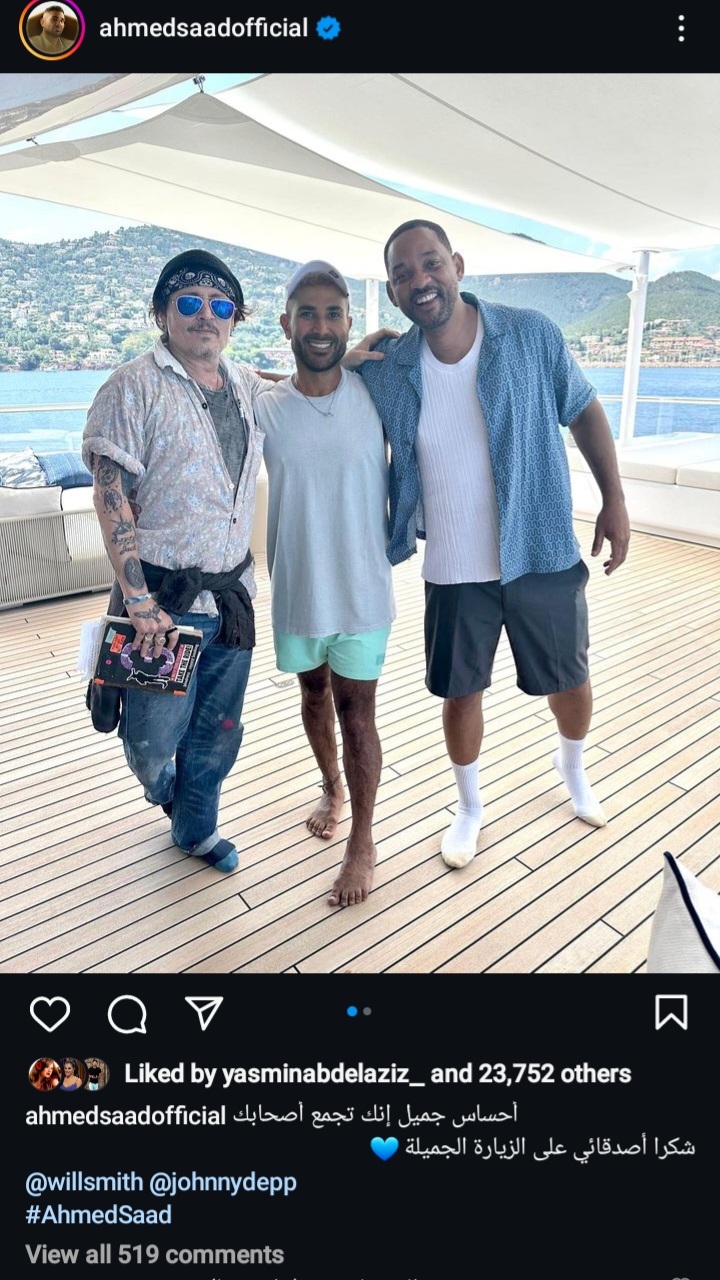 "شكرا أصدقائي على الزيارة الجميلة".. أحمد سعد في رحلة بحرية مع ويل سميث وجوني ديب