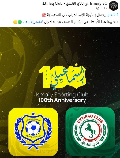 وقال نادي الإسماعيلي:" الإتفاق يحتفل بمئوية الإسماعيلي، إنتظرونا غدا الأربعاء للكشف عن تفاصيل المباراة في مؤتمر صبحي، من تنظيم شركة هابي سبورت.