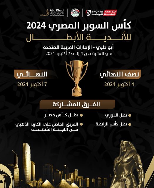 أعلنت شركة المتحدة للخدمات الإعلامية عن الفرق المشاركة في النسخة الجديدة من بطولة كأس السوبر المصري، في نسخته الثانية بالنظام الجديد، والتي تقام في دولة الإمارات العربية المتحدة، في الفترة من 4 إلي 7 أكتوبر.