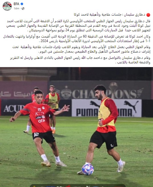 وكان احمد كوكا قد تعرض للإصابة فى الدقيقة 60 من المباراة الودية التى أقيمت مع أوكرانيا وانتهت بالتعادل 1-1 فى إطار استعدادات منتخب مصر الأوليمبي لدورة الألعاب الأولمبية باريس 2024 .