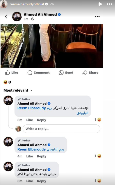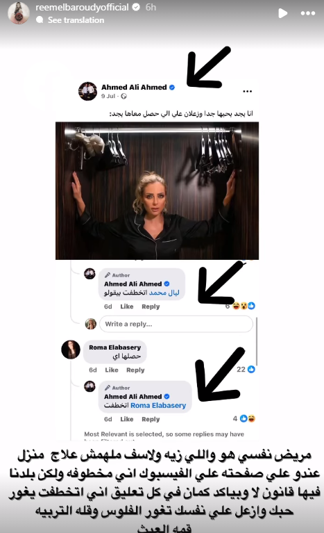 وشاركت ريم البارودي، صورة عبر حسابها على «إنستجرام»، معلقة عليها قائلة: «مريض نفسي هو واللي زيه، وللأسف ملهمش علاج، منزل على صفحته على الفيسبوك إني مخطوفة، لكن بلدنا فيها قانون، وبيأكد كمان في كل تعليق إني أتخطفت، بغور حبك وأزعل على نفسك، تغور قلة التربية والفلوس، قمة العبث».