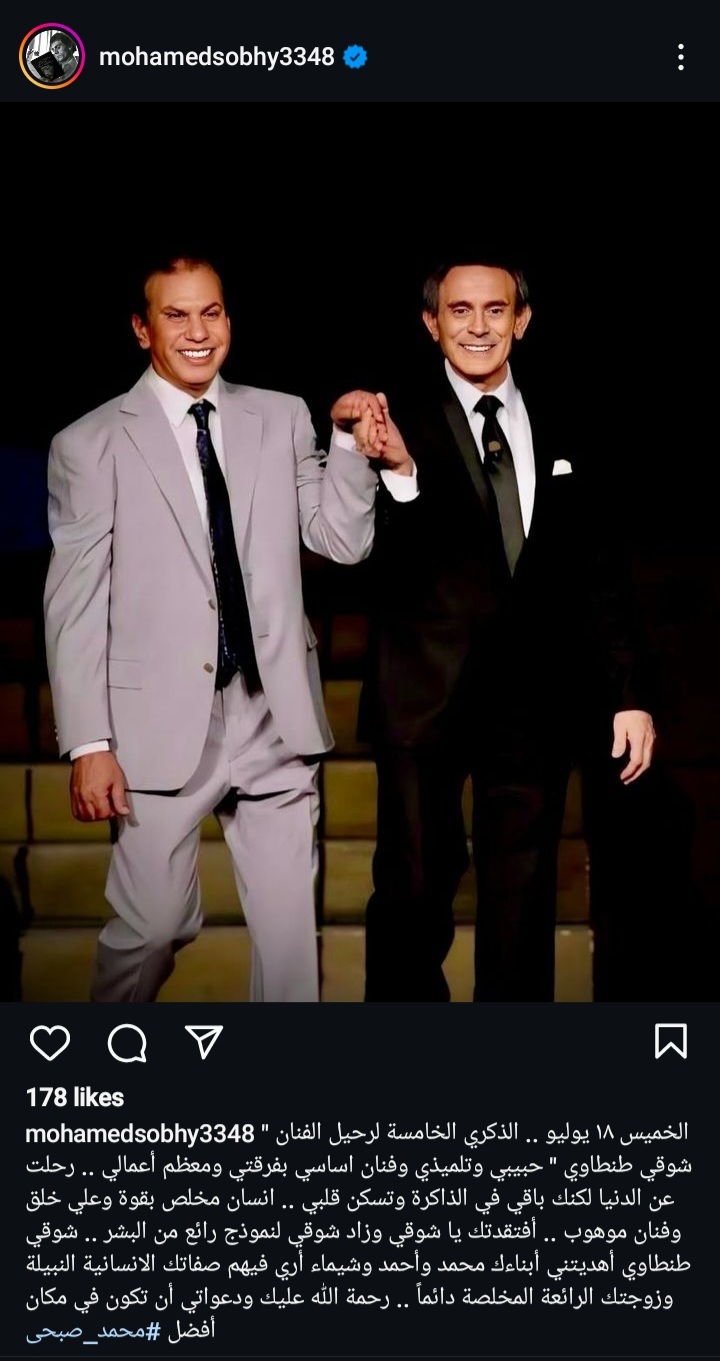 ونشر صبحي صورة عبر صفحته الرسمية " انستجرام معلقا : الخميس 18 يوليو.. الذكرى الخامسة لرحيل الفنان شوقي طنطاوي حبيبي وتلميذي وفنان أساسي بفرقتي ومعظم أعمالي، رحلت عن الدنيا لكنك باقي في الذاكرة وتسكن قلبي، إنسان مخلص بقوة وعلى خلق وفنان موهوب" .