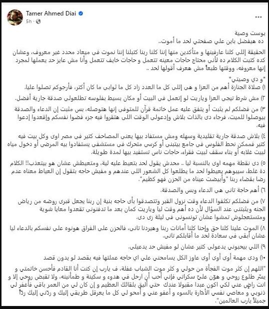 وتابع تامر ضيائي: "الحقيقة اللى كلنا عارفينها ومتأكدين منها أننا كلنا ربنا كاتبلنا إننا نموت فى ميعاد محدد غير معروف، وعشان كده كتبت الكلام ده لأنى محتاج حاجات معينة تتعمل وحاجات خايف تتعمل وأنا مش عايز حد يعملها لمجرد إنها معروفة، ووقتها طبعًا مش هعرف أقولها لحد".