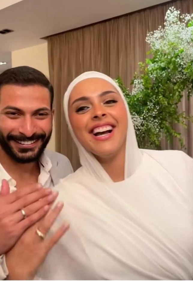 وظهرت ابنة محمد هنيدى وهى ترتدى فستانا أبيض بسيط مع خطيبها.
