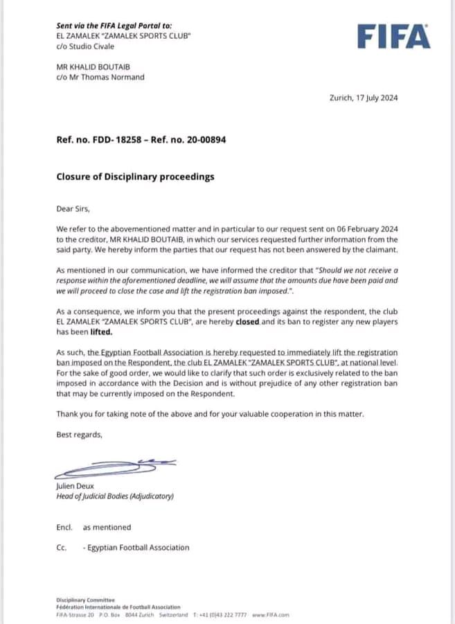 ونشر عمرو أدهم عضو مجلس إدارة الزمالك عبر صفحته في موقع التواصل إكس، الخطاب المُرسل من الفيفا وكتب: "إخطار الفيفا برفع عقوبة إيقاف القيد في قضية خالد بوطيب"