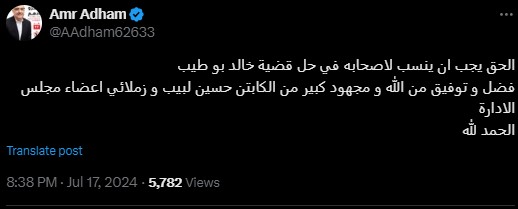 وأضاف عمر أدهم:" وتابع: «الحق يجب أن ينسب لأصحابه في حل قضية خالد بوطيب فضل وتوفيق من الله ومجهود كبير من حسين لبيب وزملائي اعضاء مجلس الإدارة».