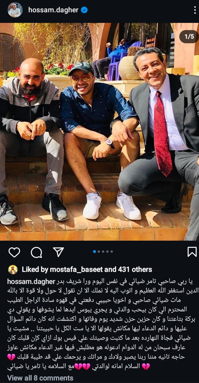 واستكمل: "مشيت يا ضيائي فجاة النهارده بعد ما كتبت وصيتك علي فيس بوك ازاي كإن قلبك كان عارف سبحان من له الدوام ادعوله هو مطلبش فيها غير الدعاء مكانش عاوز حاجه تانيه مننا ربنا يصبر ولادك ومراتك و يرحمك علي قد طيبة قلبك السلام امانه لوالدتي مع السلامه يا تامر يا ضيائي".