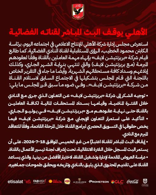 وقال الأهلي في بيانه:"استعرض مجلس إدارة شركة الأهلي للإنتاج الاعلامي في اجتماعه اليوم، برئاسة الكابتن محمود الخطيب، الرؤى المستقبلية لقناة النادي الفضائية. كما طالع قيام شركة «بريزنتيشن لايف» بإنهاء مهمة العاملين بالقناة وفقًا لعقودهم المبرمة (مع بريزنتيشن لايف) والتي تنتهي بنهاية الشهر الجاري، وكذلك إبلاغهم وسداد كافة مستحقاتهم الشهرية. وأيضًا ما جاء في التقرير الخاص باللجنة التي قام المجلس بتشكيلها في الاجتماع السابق لاستلام القناة من شركة «بريزنتيشن لايف».. وفي ضوء ما سبق قرر المجلس ما يلي: