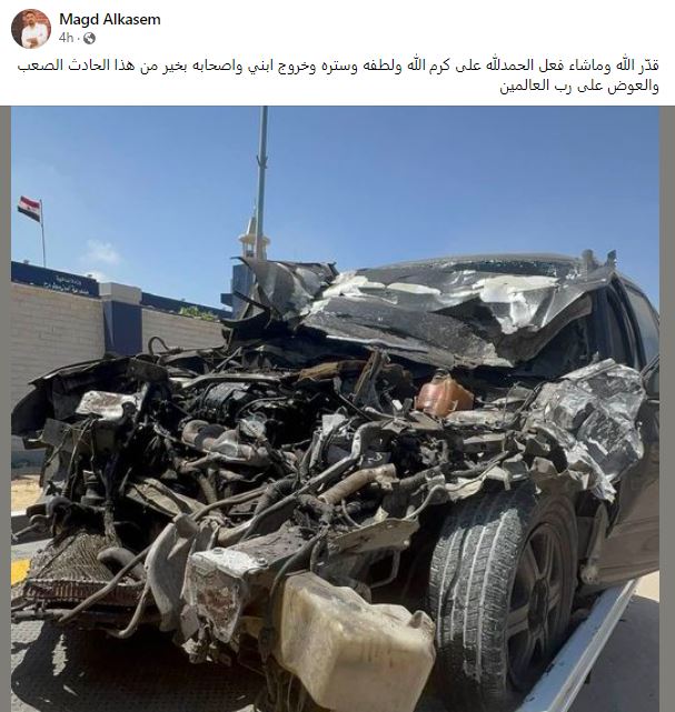 وقال مجد قاسم عبر صفحته الرسمية على موقع التواصل الاجتماعي “فيسبوك”: “قدّر الله وماشاء فعل الحمدلله على كرم الله ولطفه وستره وخروج ابني واصحابه بخير من هذا الحادث الصعب والعوض على رب العالمين”.