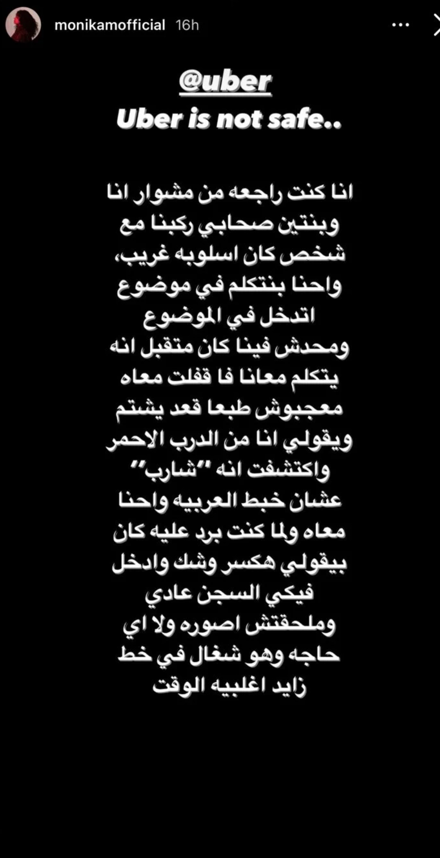 وكشفت الفتاة في استوري لها قامت بنشره علي تطبيق انستجرام إنها طلبت رحلة عبر شركة أوبر رفقة أصدقائها وأثناء سيرها تدخل السائق في حديثها مع صديقاتها وباعتراض الفتاة على ما فعله تعدى عليها بالسباب وهددها بالقتل.