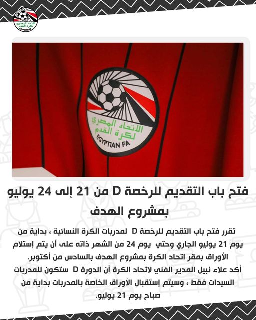 أعلن اتحاد الكرة المصري، لكرة القدم على الصفحة الرسمية عبر موقع التواصل فيسبوك، فتح باب التقديم، لحصول المدربات على الرخصة D ، بمقر الاتحاد المصري بمشروع الهدف بمدينة 6 أكتوبر.