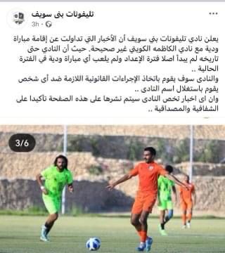 أعلن نادي تليفونات بني سويف الناشاط في دوري الدرجة الثانية المصرس "الممتاز ب"، أنه لم يخوض أي مباراة ودية مع فريق كاظمة الكويتي، وأنه أي مباريات ودية خلال الفترة الحالية، وذلك في بيان رسمي على موقع التوواصل الاجتماعي “فيسبوك”.