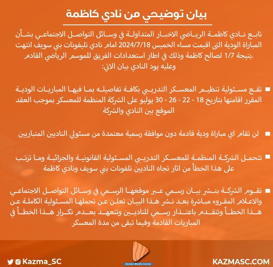 وأوضحت إدارة فريق كاظمة الكويتي في بيان سمي، أنهم تابعوا الأخبار المتداولة عبر مواقع التواصل الاجتماعي بشأن مباراة الفريق الودية التي أقيمت يوم الخميش 18 يوليو أمام تليفونات بني سويف، والتي انتهت بفوز فريقه بسبعة أهداف مقابل هدف.