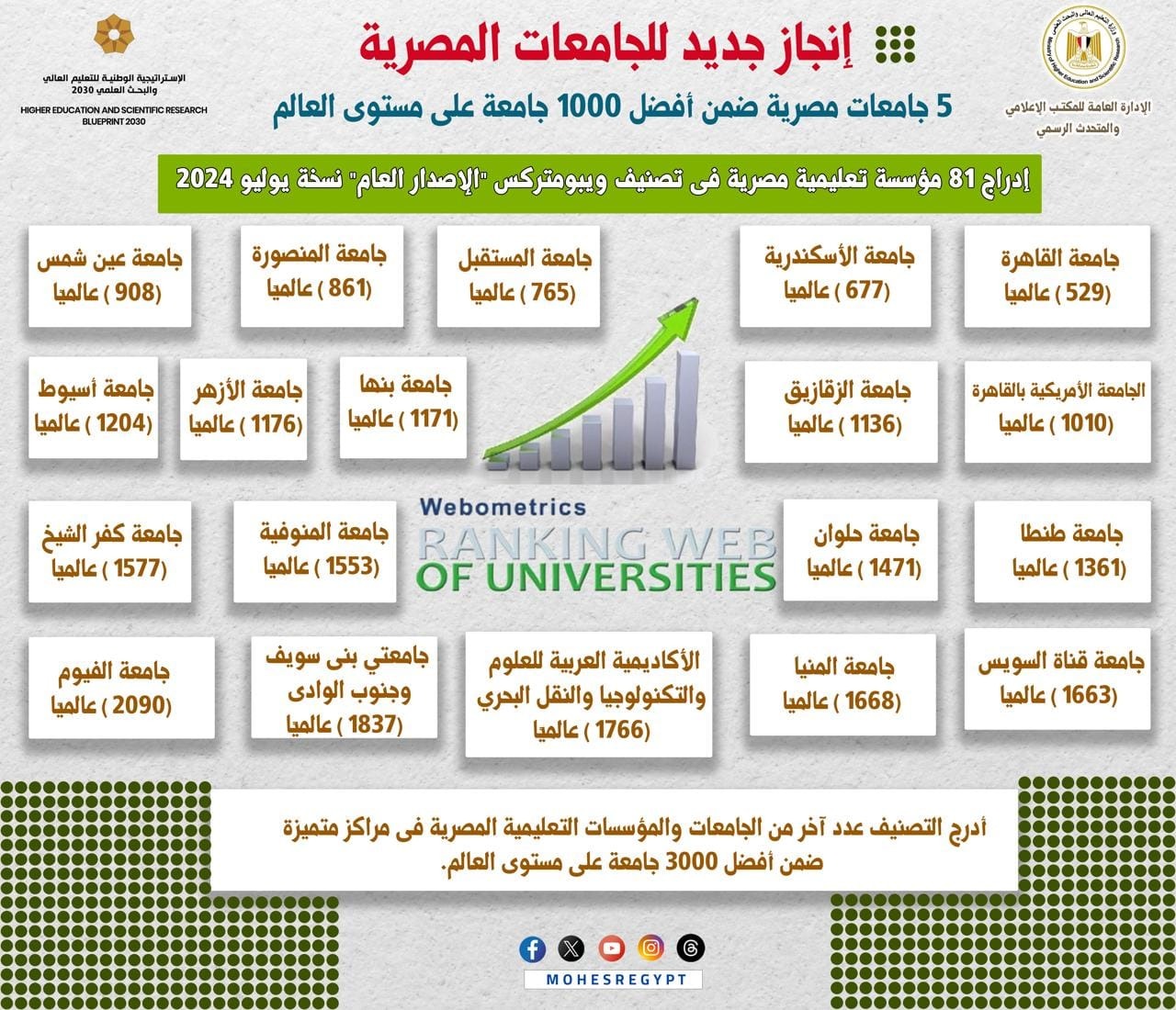 أعلن تصنيف ويبومتركس صدور نسخة يوليو 2024 من "التصنيف العام"، والتي شهدت إدراج 81 مؤسسة تعليمية مصرية.