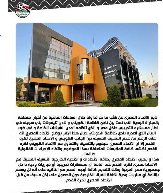 وقال الاتحاد المصري في بيانه: “تابع الاتحاد المصري عن كثب ما تم تداوله خلال الساعات الماضية من أخبار تتعلق بالمباراة الودية التي تمت بين نادي كاظمة الكويتي و نادي تليفونات بني سويف في اطار معسكره التدريبي داخل مصر والذي تنظمه احدى الشركات الخاصة و في ضوء البيان الذي أصدره نادي كاظمة الكويتي حيال هذا الأمر يوضح الاتحاد المصري أنه على الرغم من عدم التنسيق المسبق بين الجانب الكويتي و الاتحاد المصري لكرة القدم إلا ان الاتحاد المصري سيقوم بالتنسيق والتعاون مع الاتحاد الكويتي لكرة القدم لكشف كافة الملابسات المتعلقة بهذا الموضوع واتخاذ الإجراءات القانونية حيالها”