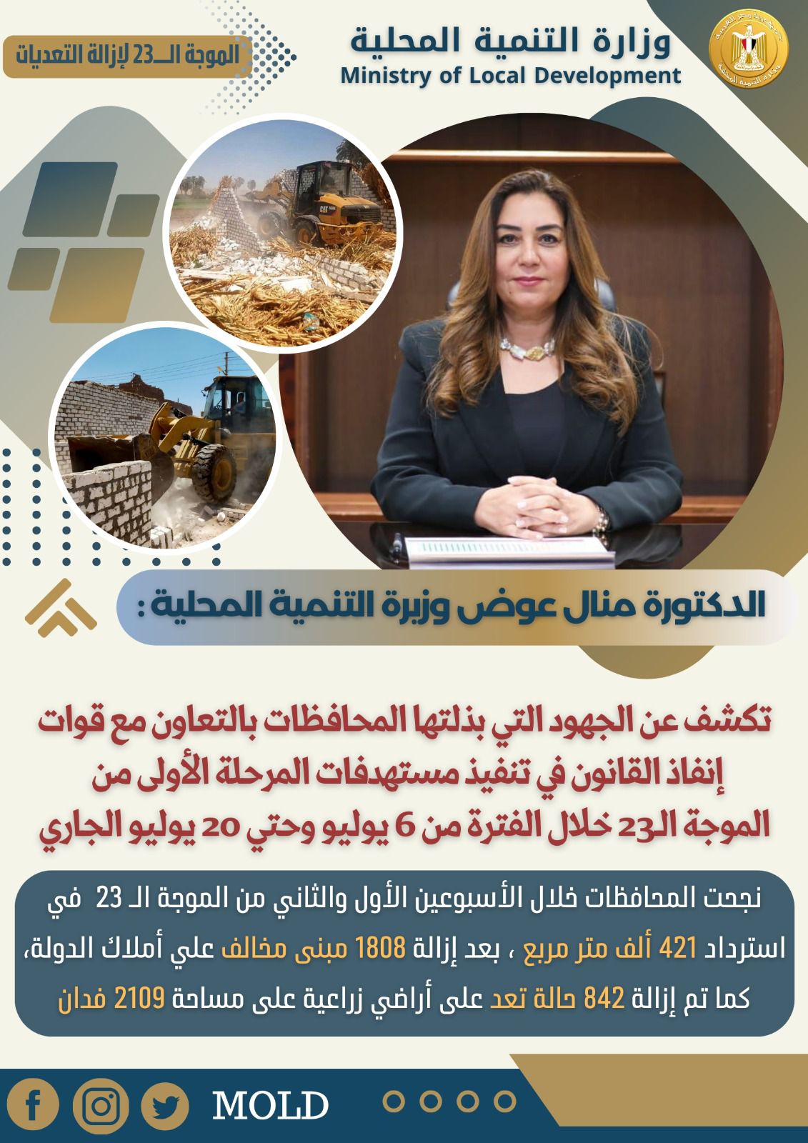 كشفت الدكتورة منال عوض وزيرة التنمية المحلية، عن الجهود التي بذلتها المحافظات بالتعاون مع قوات إنفاذ القانون والأجهزة المعنية بالمحافظات في تنفيذ حالات الإزالة منذ بدء أعمال المرحلة الأولى من الموجة الـ23 في 6 يوليو وحتي 20 يوليو الجاري، حيث نجحت الدولة في استرداد حوالي 421 ألف متر مربع بعد إزالة 1808 مبنى مخالفًا على أملاك وأراضي الدولة وإزالة 842 حالة تعدٍ على الأراضي الزراعية على مساحة 2109 فدانًا.