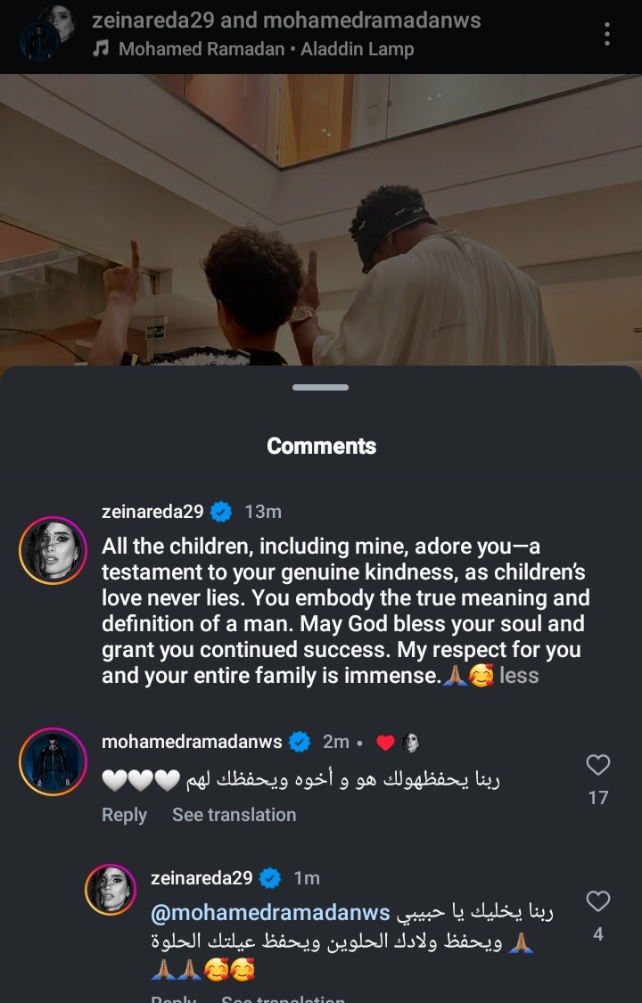 نشرت الفنانة زينة صور لابنها مع محمد رمضان عبر صفحتها الرسمية " أنستجرام " وعلقت عليها " كل الاطفال بيحبوك بما فيهم اطفالي وهذا يدل علي لطفك لان الاطفال لا يكذبون مع احترامي ليك ولعائلتك واتمني لك النجاح "