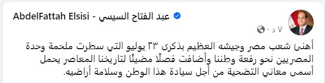 وقال الرئيس عبر تدوينة له على صفحته الرسمية: أهنئ شعب مصر وجيشه العظيم بذكرى ٢٣ يوليو التي سطرت ملحمة وحدة المصريين نحو رفعة وطننا وأضافت فصلًا مضيئًا لتاريخنا المعاصر يحمل أسمى معاني التضحية من أجل سيادة هذا الوطن وسلامة أراضيه.