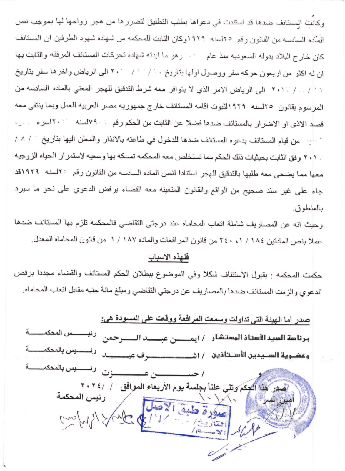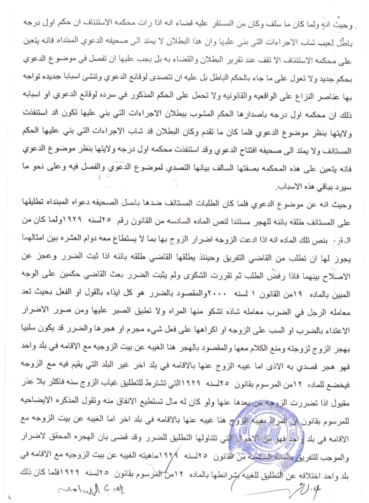 حكم هام اصدرته محكمه استئناف القاهره لشئون الاسره قد يكون هو الحكم الاول من نوعه - حيث قضت المحكمه بحكم نهائي برفض دعوي طلاق للضرر اقامتها الزوجه استنادا لنص الماده السادسه من القانون رقم 25 لسنه 1929 علي سند من القول ان الزوج قد هجر منزل الزوجيه وان ذلك قد اضر بها بما لا تستطيع معه دوام العشره بين امثالهما وكانت محكمه الاستئناف قد قامت بالرد علي هذا الادعاء وانتهت الي الحكم برفض هذه الدعوي - حكم هام سوف يغير موازين كثير من الدعاوي المقامه حاليا.