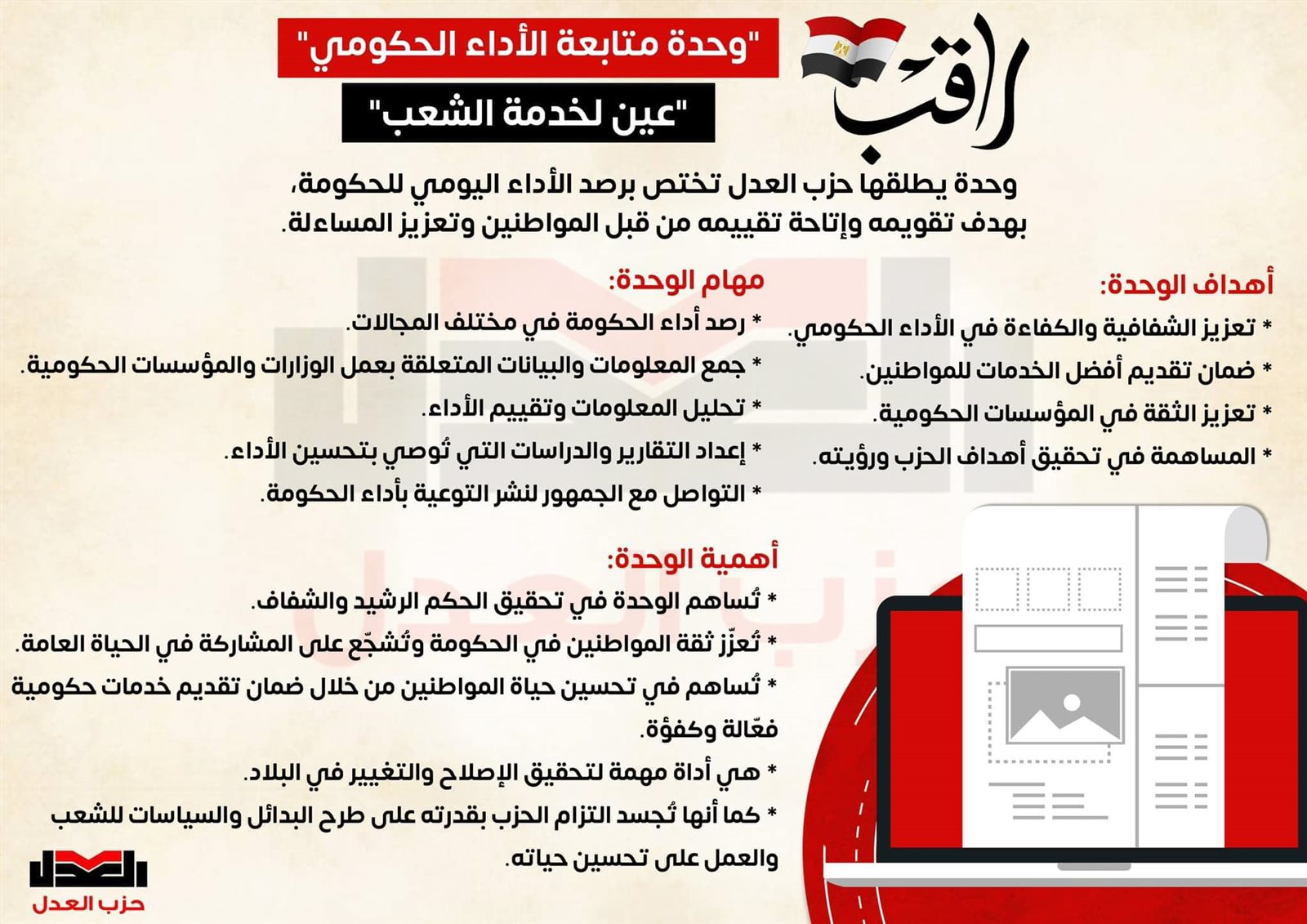 وأضاف: "بالتزامن مع موافقة البرلمان على منح الثقة للحكومة الجديدة، يطلق حزب العدل الوحدة الأولى من نوعها في الحياة الحزبية المصرية، تحت اسم راقب".
