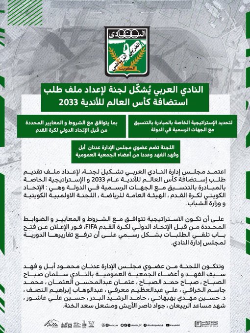 أعلن نادي العربي الكويتي عن تشكيله لجنة لإعداد ملف طلب استضافة بطولة كأس العالم للأندية 2033.
