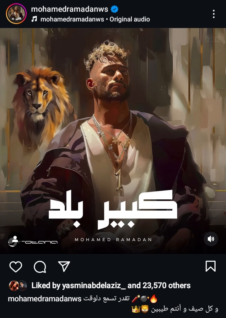 طرح النجم محمد رمضان أحدث أعماله الغنائية بعنوان "كبير بلد"ونشر رمضان الأغنية عبر صفحاته الرسمية معلقآ عليها كل صيف وانتم طيبين ".
