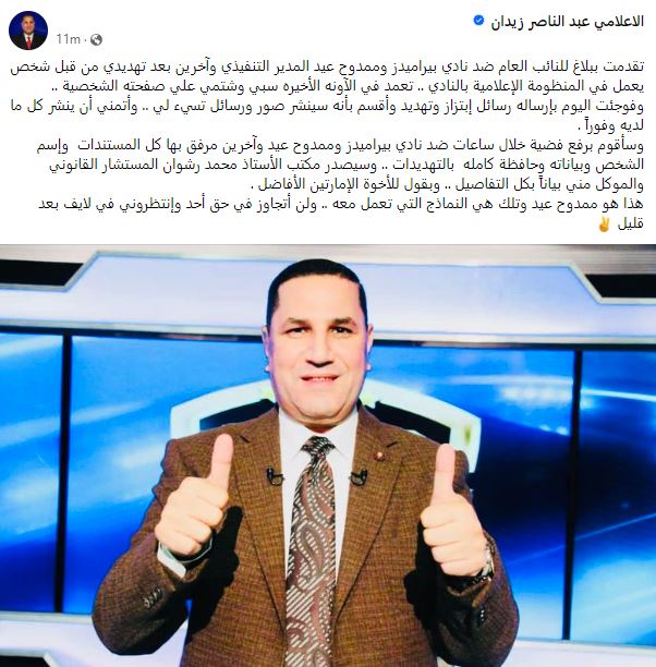 تقدم الإعلامي الرياضي عبدالناصر زيدان ببلاغ للنائب العام ضد نادي بيراميدز وممدوح عيد المدير التنفيذي وآخرين بعد تهديدي من قبل شخص يعمل في المنظومة الإعلامية بالنادي.
