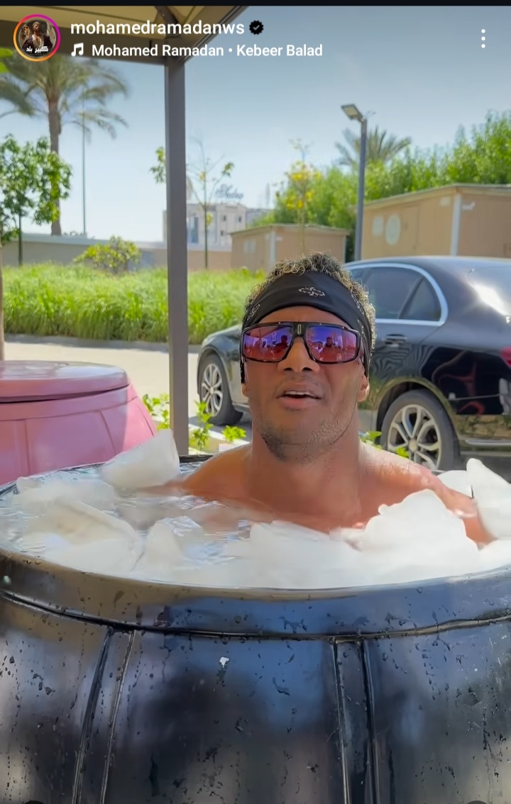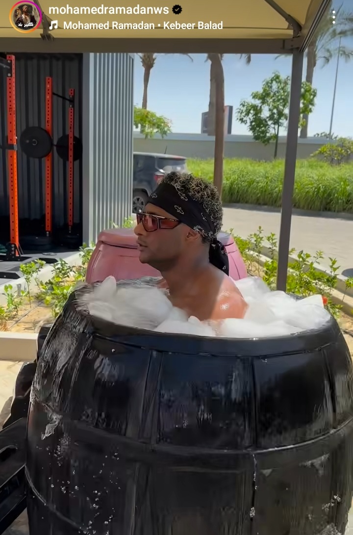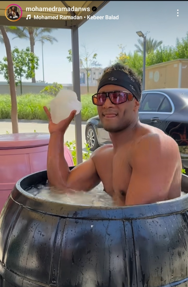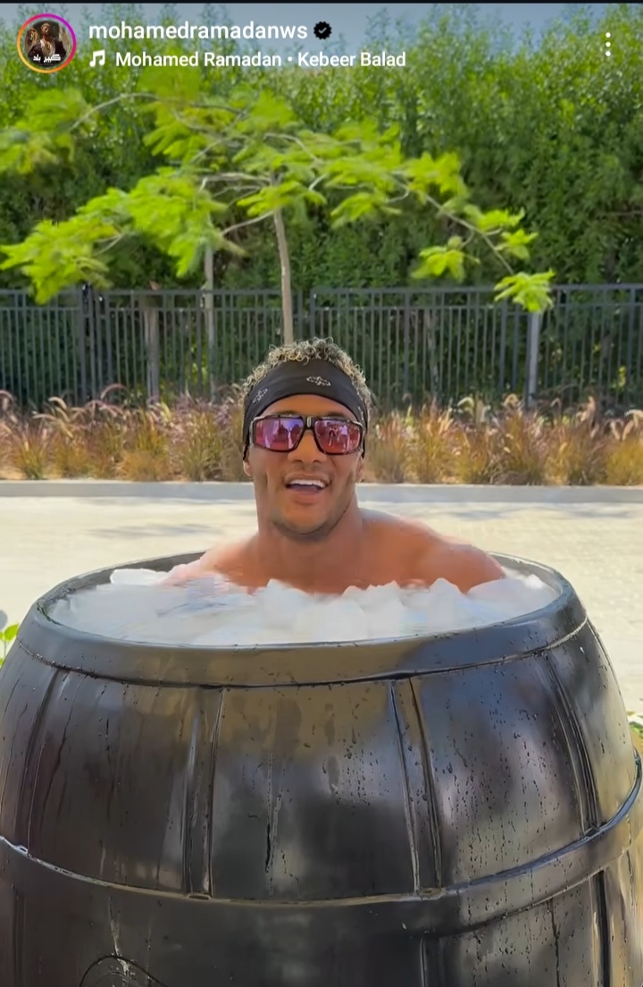 شارك النجم محمد رمضان متابعية عبر حسابه الرسمي " انستجرام" مقطع فيديو يمارس فية الاسلوب الاستشفائي بالثلج ويظهر رمضان في الفيديو يغني مقطع من أغنيته الجديدة " أتيت أنا " ويغطس في برميل ملئ بالثلج .