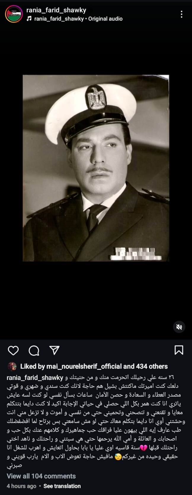 ونشرت رانيا فريد شوقي مقطع فيديو مدمج به مجموعة من الصور لوالدها من أعماله الفنية وعلقت عبر حسابها بموقع "انستجرام": 26 عاما على رحيلك اتحرمت منك ومن حنيتك ودلعك وكنت أميرتك وماكنتش بشيل هم حاجة لأنك كنت سندي وضهري وقوتي ومصدر العطاء والسعادة وحصن الأمان، وساعات بسأل نفسي لو كنت لسه عايش يا ترى أنا كنت همر بكل اللي حصل لي في حياتي الإجابة أكيد لأ.
