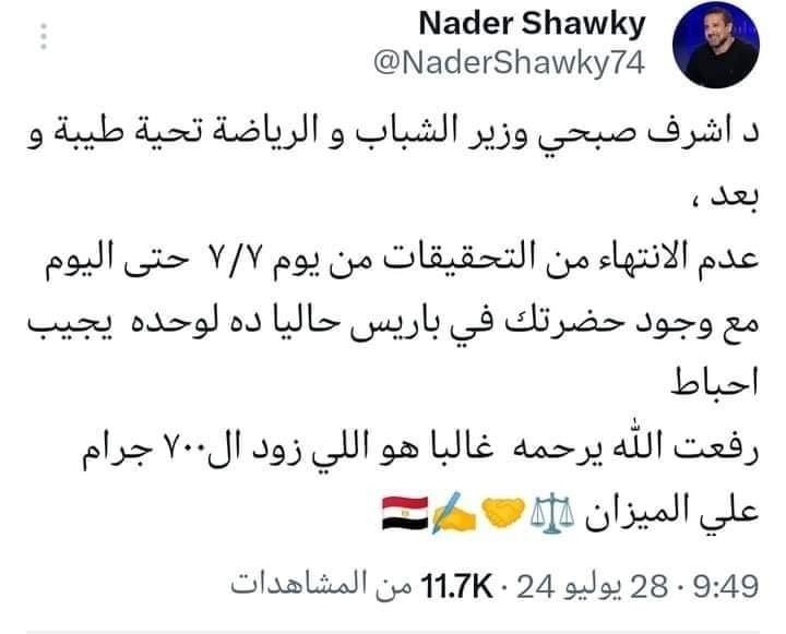 وكتب نادر شوقي عبر حسابه الشخصي على منصة "إكس" : " د. أشرف صبحي وزير الشباب والرياضة تحية طيبة وبعد، عدم الانتهاء من التحقيقات من يوم 7/7، حتى اليوم مع وجود حضرتك في باريس حاليًا ده لوحده يجيب إحباط "