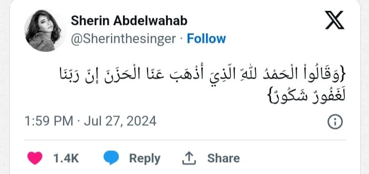 ومن ناحية أخرى، نشرت الصفحة المنسوبة لشيرين، الأية القرآنية :{وَقَالُواْ الْحَمْدُ للّهِ الّذِيَ أَذْهَبَ عَنّا الْحَزَنَ إِنّ رَبّنَا لَغَفُورٌ شَكُورٌ}، ليتفاعل معها عدد من محبيها داعين الله لها أن تكون هذه خطوة جديدة للعودة.