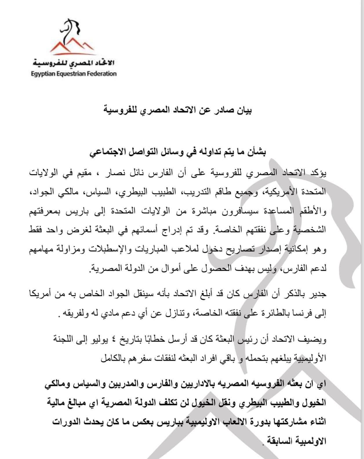 وأضاف اتحاد الفروسية المصري في بيانه أن الفارس قد أبلغ الاتحاد بأنه سينقل الجواد الخاص به من أمريكا إلى فرنسا بالطائرة على نفقته الخاصة، وتنازل عن أي دعم مادي له ولفريقه.
