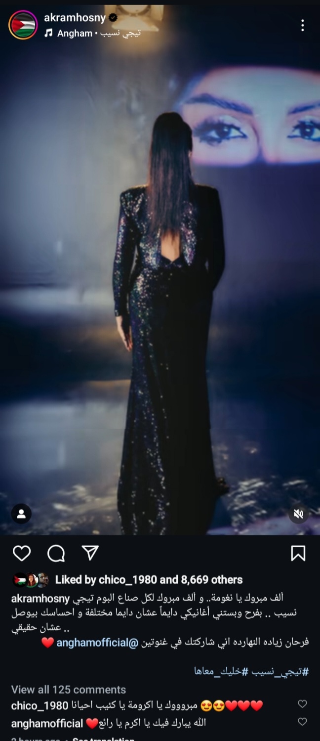 انغام .. ونشر أكرم جزء من أغنية "تيجي نسيب" على صفحته الرسمية عبر موقع تبادل الصور والفيديوهات "إنستجرام" وعلق عليها " الف مبروك يا نغومة والف مبروك لكل صناع الالبوم تيجي نسيب بفرح وبستنا اغانيكي دايمآ مختلفة وأحساسك بيوصل علشان مختلفة".