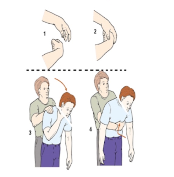 اضغط خمس ضغطات على البطن إذا لم تؤدّ ضربات الظهر إلى إزالة الجسم العالق، فاضغط خمس ضغطات على البطن، وهو ما يُعرف أيضًا بمناورة هايمليش.