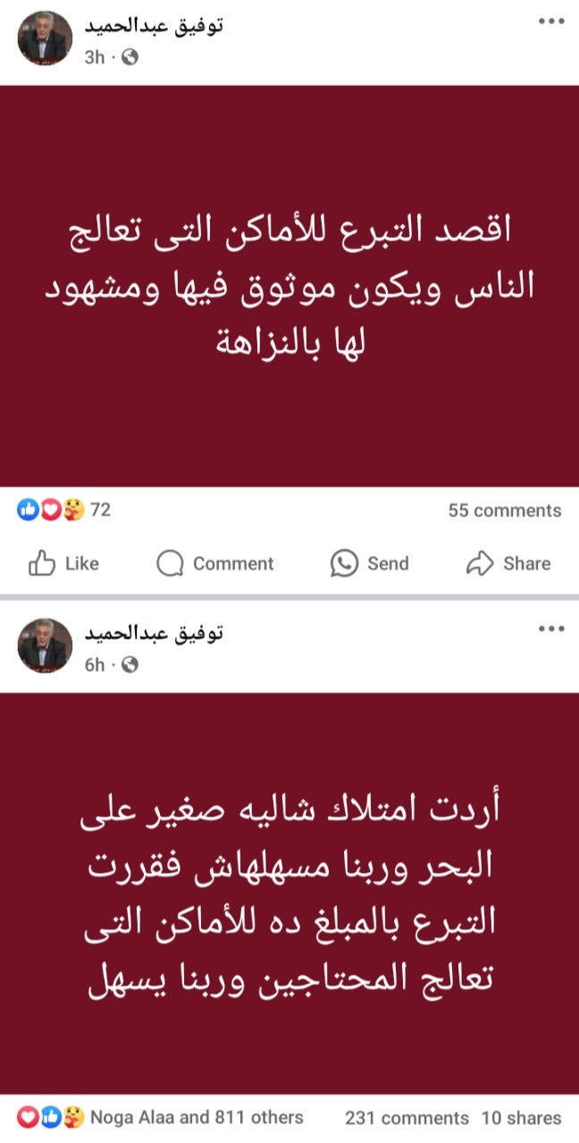 تبرع الفنان القدير توفيق عبدالحميد بمبلغ مالي للمحتاجين وهو ثمن شالية وكشف عن تقديمه تبرع للأماكن المتخصصة في علاج المحتاجين ونشر الفنان توفيق عبد الحميد منشور معلقآ: “أردت امتلاك شاليه صغير على البحر وربنا مسهلهاش، فقررت التبرع بالمبلغ ده للأماكن التي تعالج المحتاجين وربنا يسهل والتبرع للأماكن التي تعالج الناس ويكون موثوق ”.