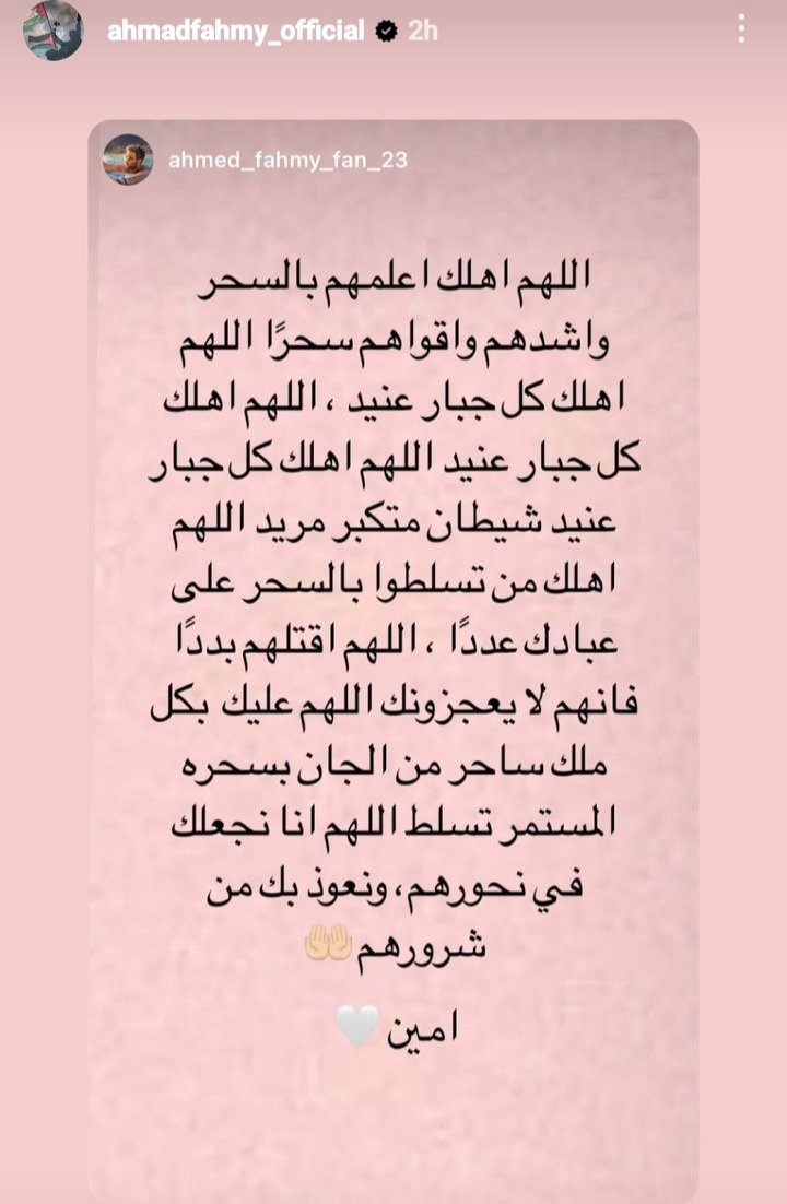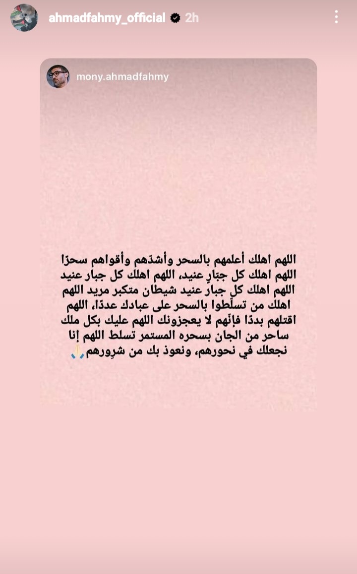 نشر الفنان أحمد فهمي صورة لشقيقه الفنان كريم فهمي مع زوجته ووالدته وأثار الأستوري الذي نشره عبر صفحته الرسمية " إنستجرام" جدلا حول أصابة عائلته للسحر حيث نشر آيات قرانية التي تقي من السحر ودعا الله إن يبعد عنهم السحر وكتب عبر ستوري " ربنا يحفظكوا ليا ولبعض ويبعد عننا شر الأعمال والسحر الأسود والسحرة والفجر عند الخصومة، ويديم علينا نعمة قرب ولاد الأصول دايمًا.