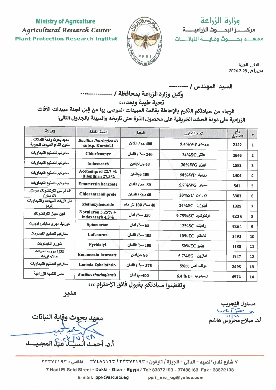 وأوضح الدكتور أحمد عبدالمجيد مدير المعهد أن التوصيات المحدثة لمكافحة دودة الحشد على الذرة تتضمن التوعية بالمبيدات الموصي بها والتي بلغت أربعة عشر مبيداً معتمداً من قِبل لجنة مبيدات الآفات الزراعية برئاسة الدكتور محمد عبدالمجيد و هي: