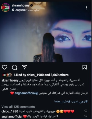 كما هنأ أكرم حسني أنغام على طرح الألبوم وذلك عندما نشر جزء من الأغنية على صفحته الرسمية عبر موقع تبادل الصور والفيديوهات "إنستجرام" وعلق قائلا : " الف مبروك يا نغومة والف مبروك لكل صناع الالبوم تيجي نسيب بفرح وبستنا اغانيكي دايمآ مختلفة وأحساسك بيوصل علشان مختلفة ".